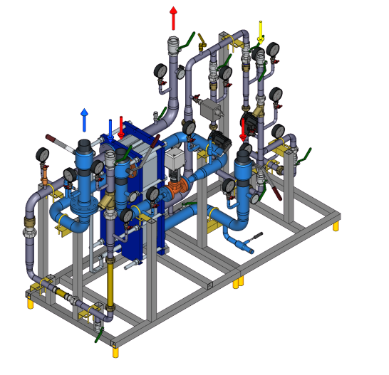 Стандартный тепловой пункт для закрытой системы ГВС на базе моноблочного ПТО с двухходовым регулирующим клапаном и резервом насосов 2х100%